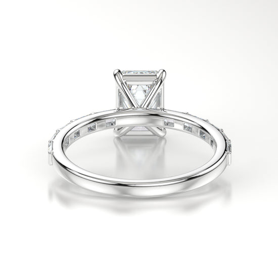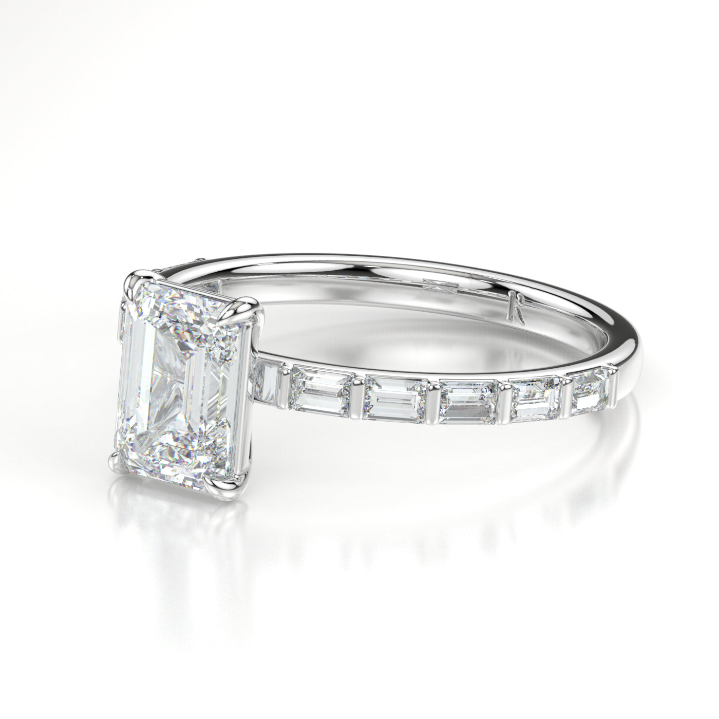 Presenting the Amina Engagement Ring, a masterpiece adorned with 2mm emerald side stones intricately set along the band, all crafted with precision in our Hatton Garden workshop.