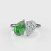 The Skye ready-to-wear engagement ring is a masterpiece of elegance, crafted in luxurious platinum. At its heart lies a 1.30ct natural pear-shape emerald gemstone, alongside a 1.02ct lab-grown Pear shaped diamond with top colour (F) and top clarity (VS1) certified by IGI: LG723519997