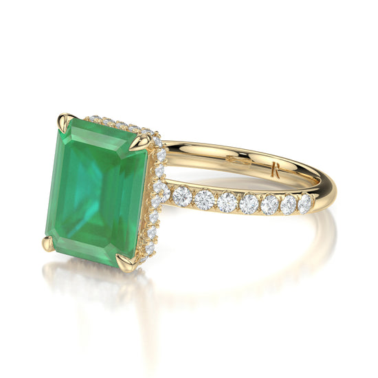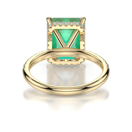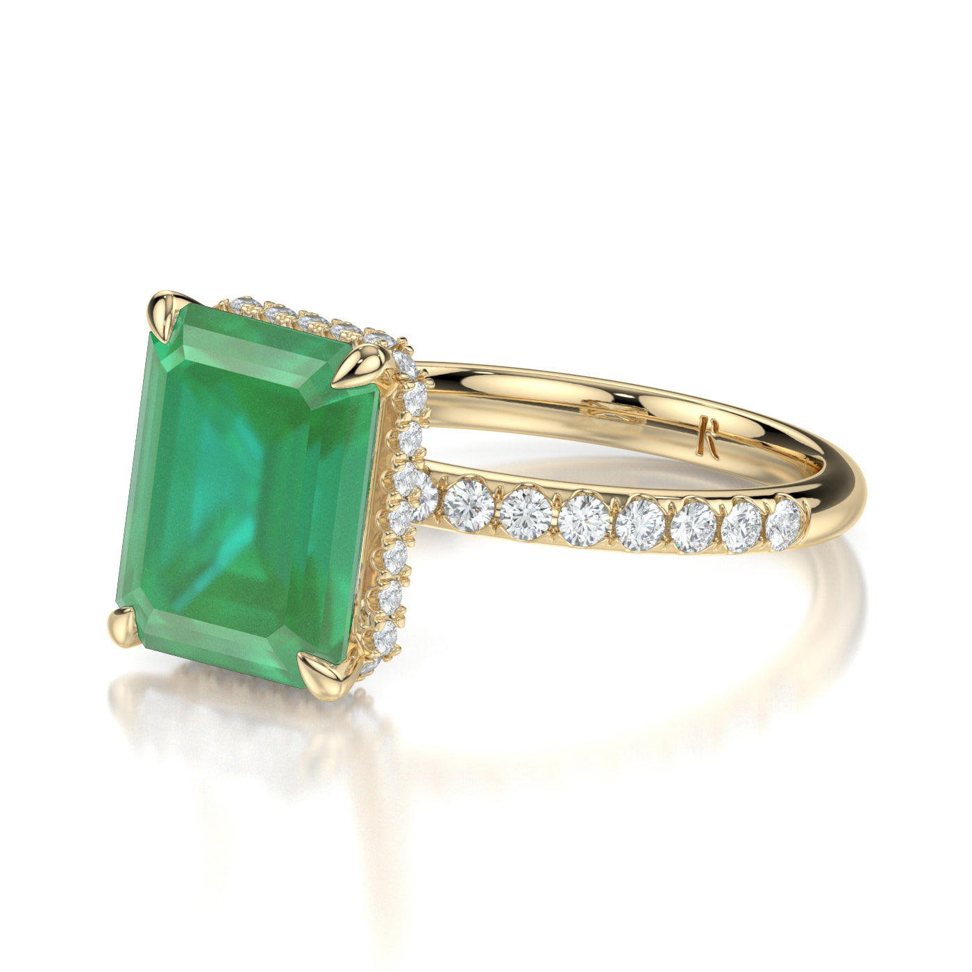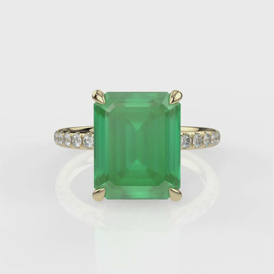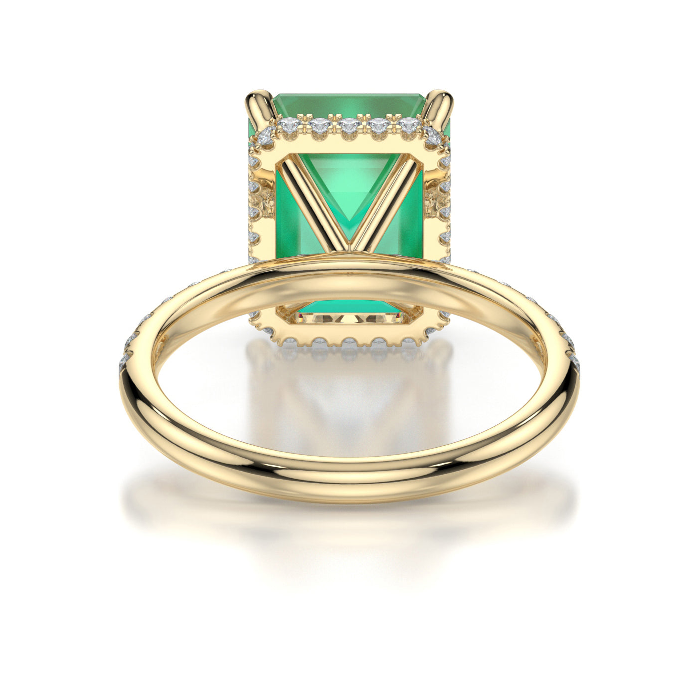The Diana ready-to-wear engagement ring is a masterpiece of elegance, crafted in luxurious yellow gold. At its heart lies a brilliant 3.76ct Emerald, certified by the Gem & Pearl Laboratory.