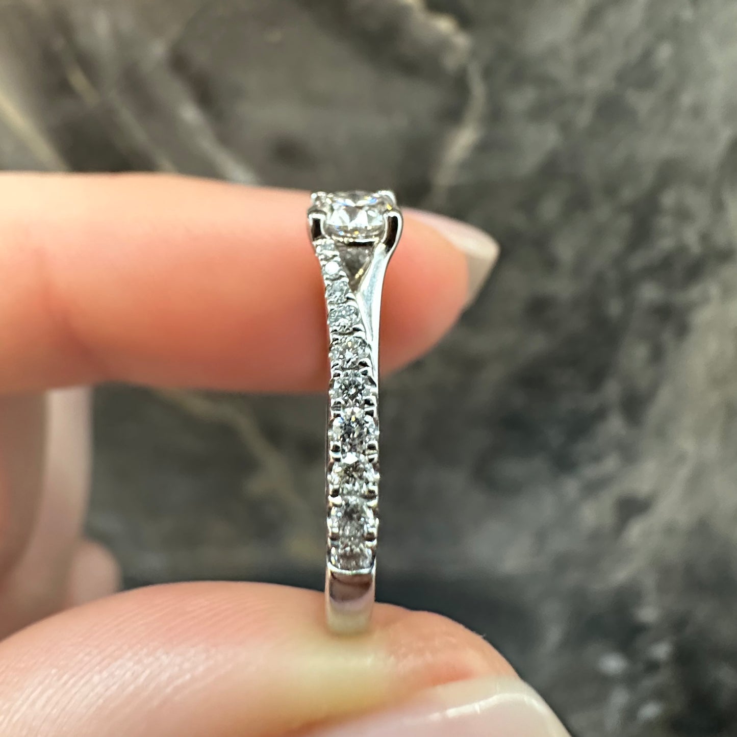 The Elisia ready to wear engagement ring in 18k white gold. The centre natural diamond is a 0.34ct, with top colour (K) and top clarity (SI1) - certified by GIA no: 2195115108