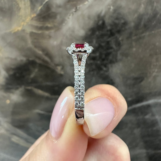 The Rose ready-to-wear engagement ring is a masterpiece of elegance, crafted in luxurious platinum. At its heart lies a beautiful 0.50ct natural ruby gemstone- uncertified.