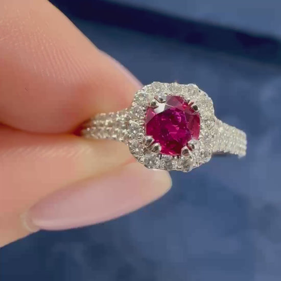 This exquisite natural ruby engagement ring features a vibrant centre stone, gracefully surrounded by a diamond halo and an elegant diamond band. Crafted in 950 platinum, this exceptional piece bears the prestigious UK hallmark, ensuring the highest standard of luxury and quality. Finger size (N)