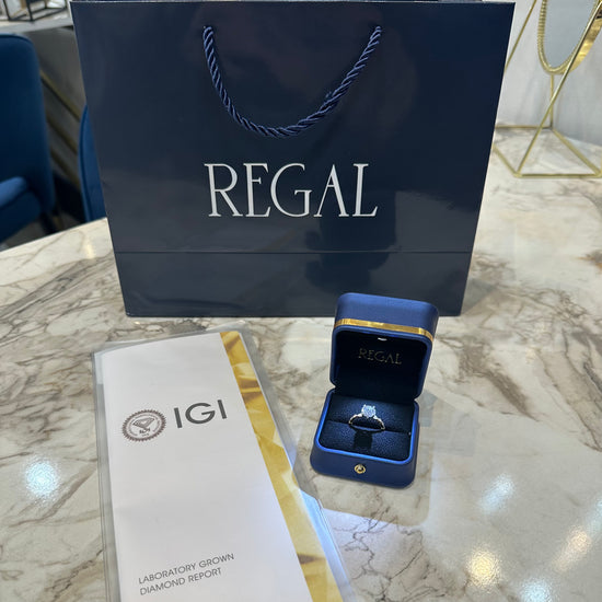 The Victoria ready-to-wear engagement ring is a masterpiece of elegance, crafted in luxurious 18k yellow gold and platinum. At its heart lies a brilliant 1.60ct lab-grown round cut diamond, showcasing exceptional top colour (F) and top clarity (VS2) - certified by IGI: LG576346592.