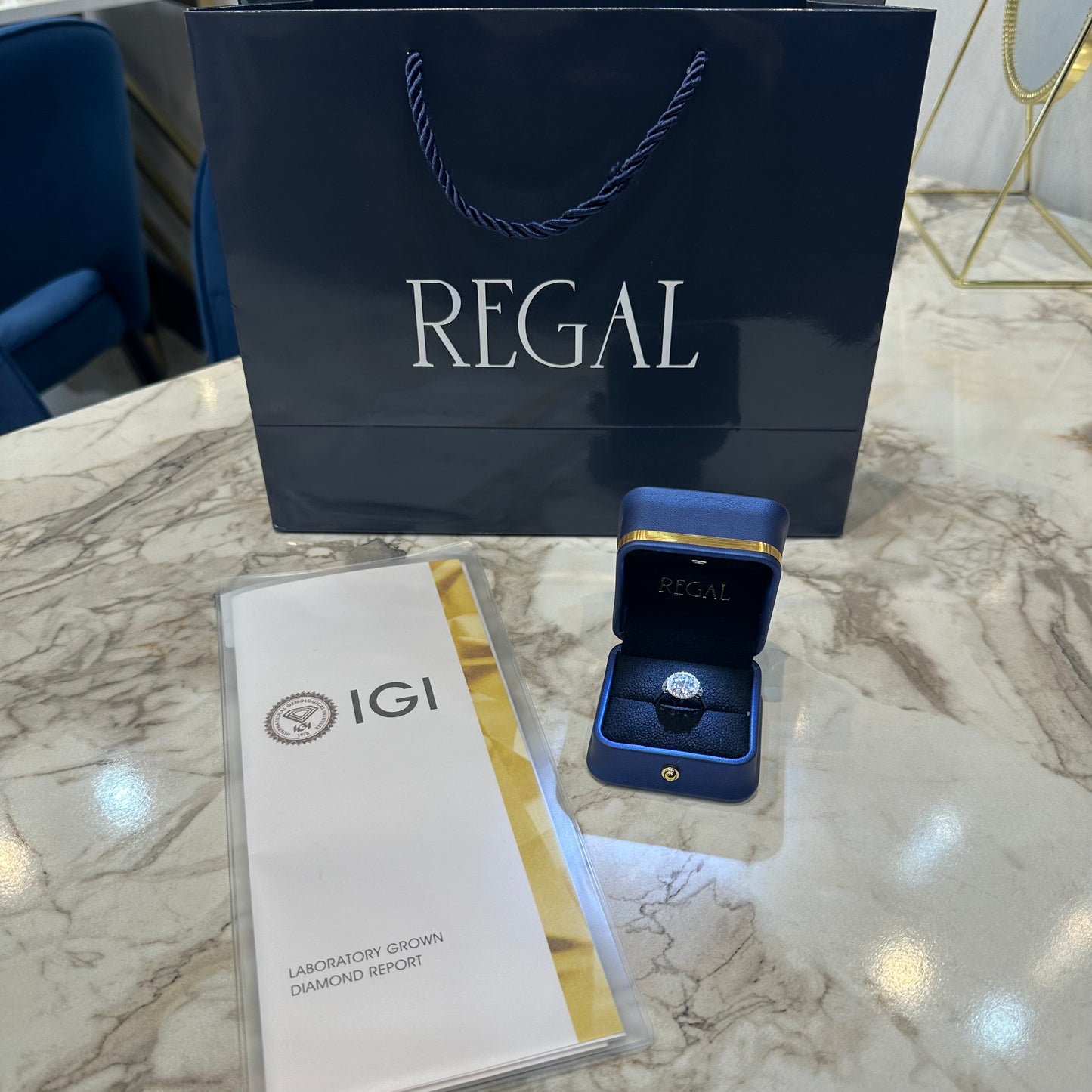 The Zeya ready-to-wear engagement ring is a masterpiece of elegance, crafted in luxurious platinum. At its heart lies a brilliant 1.70ct lab-grown round cut diamond, showcasing exceptional top colour (E) and top clarity (VS1) - certified by IGI: LG464117087